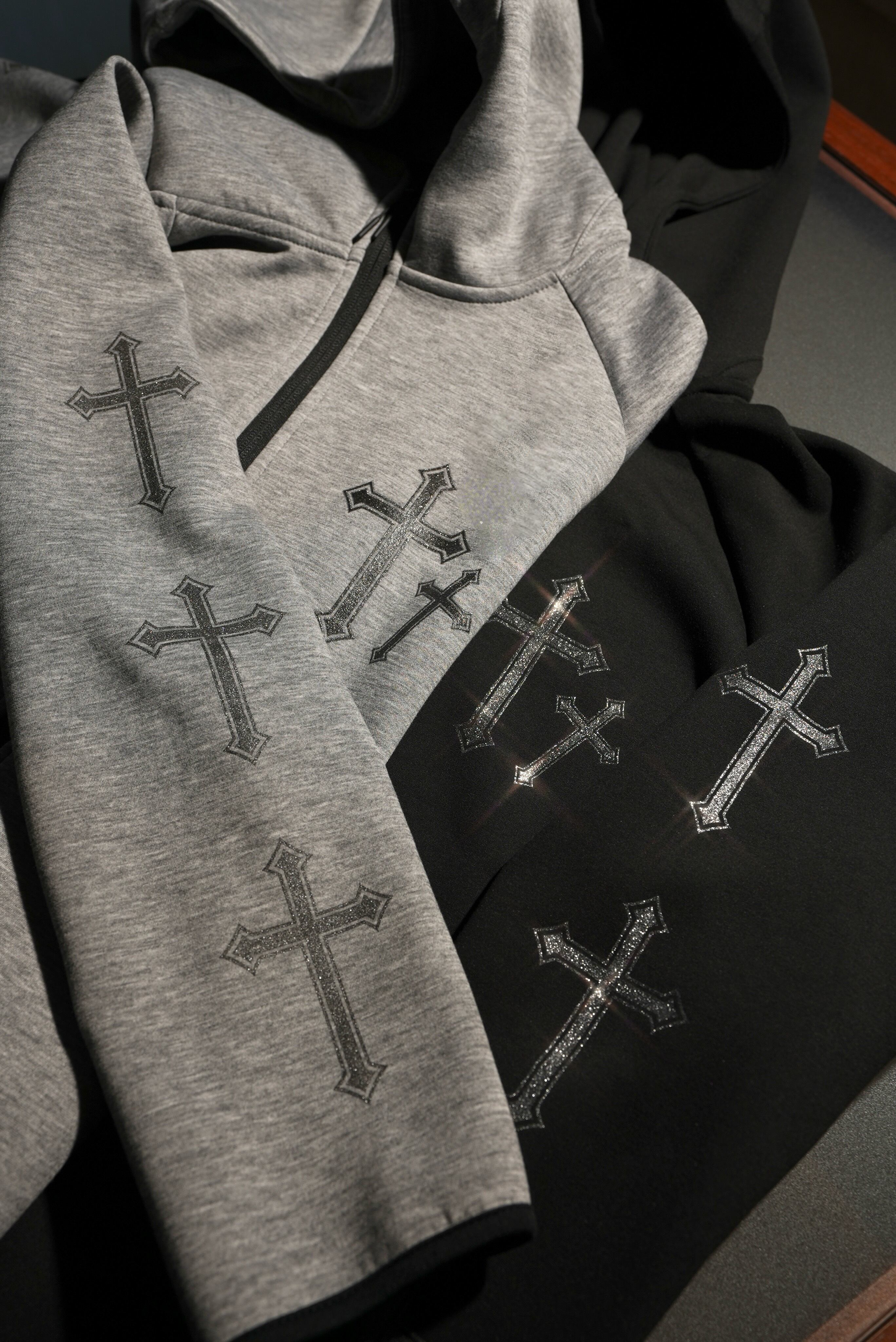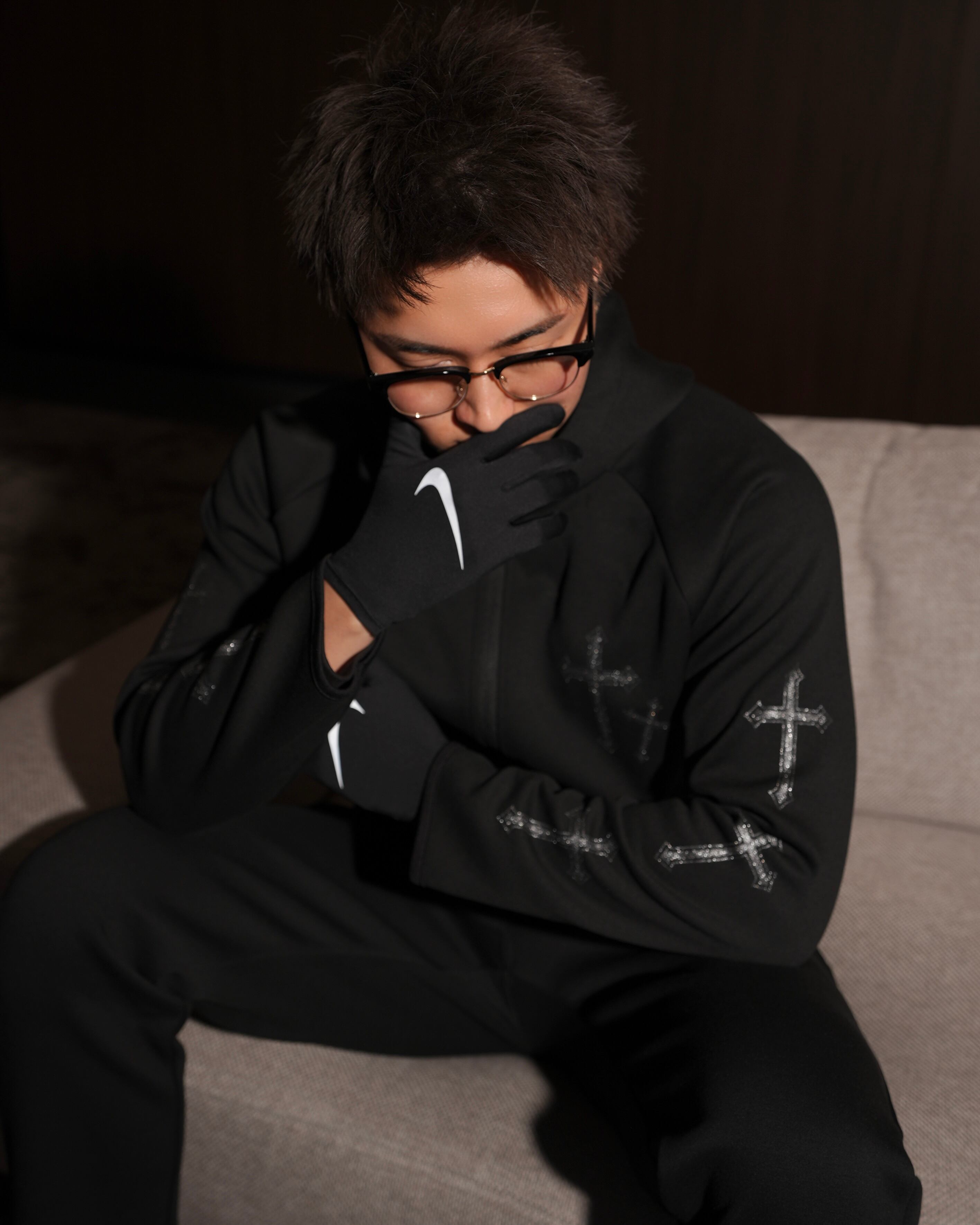 クロスロゴを胸元だけではなくサイドにもラメロゴで配置し、着映えする一着に仕上げました。